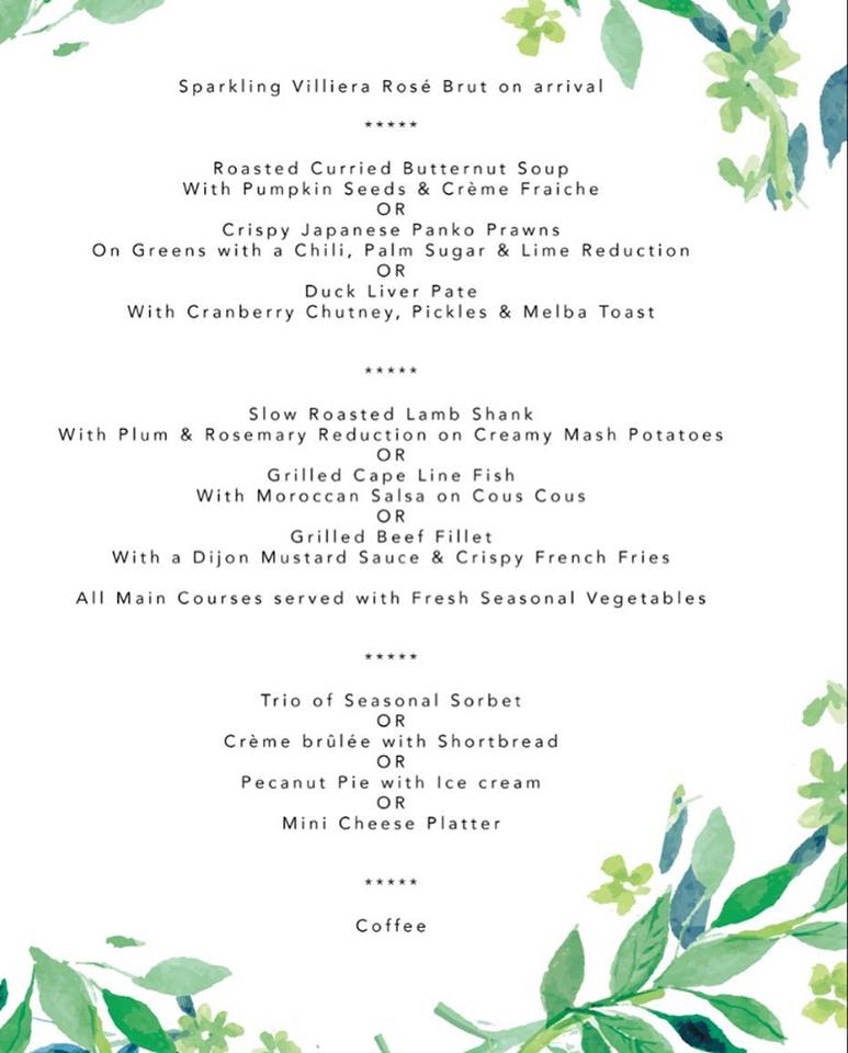 On Mother’s Day, treat your very special mom to a sumptuous 3 course meal she won’t forget! The menu below is available for only R485 per person, while special rates for children apply. Please arrive at 12h30 so the lunch can start from 13h00. Booking for the event is essential!