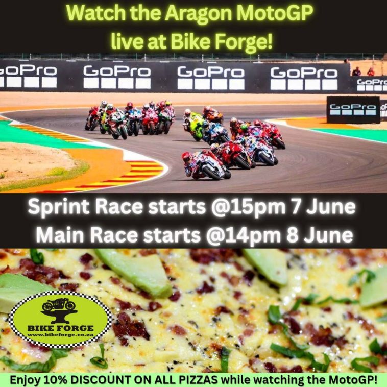 Gearheads and pizza lovers, clear your calendars for 7 and 8 June because the Aragon MotoGP will be showing live on the big screens — and The Bike Forge is cranking up the flavour with 10% off all pizzas during race time.