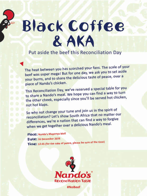 Why? Because nothing brings people together like sharing a meal, especially Nando’s. So Nando’s are after Bonang, AKA and Somizi this Reconciliation Day – plus a couple more feuding celebs.