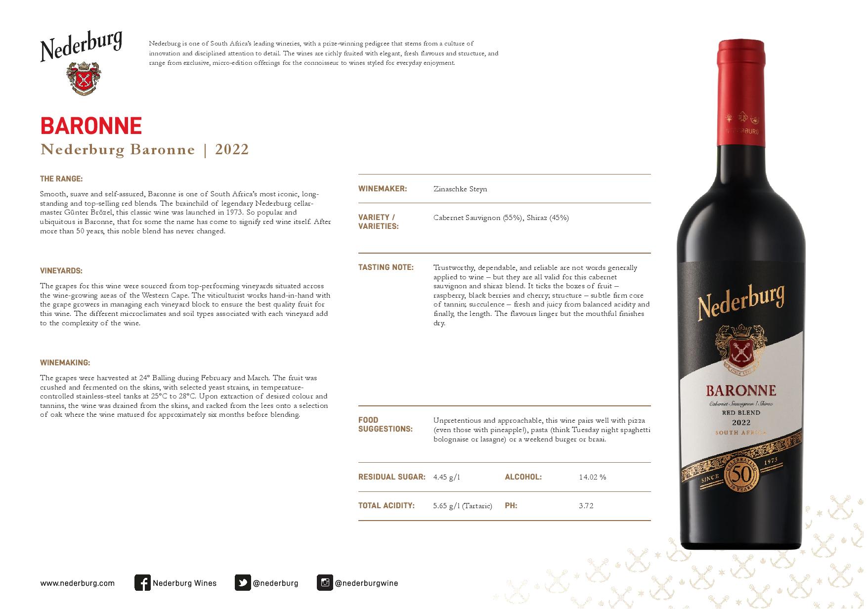 In selecting the name for the wine, Brözel led the way through his belief that Baronne, although a modestly priced wine made for everyday enjoyment, would bear a noble name that would further enhance the Nederburg brand and its reputation as one of South Africa – and the world’s – leading wineries.
