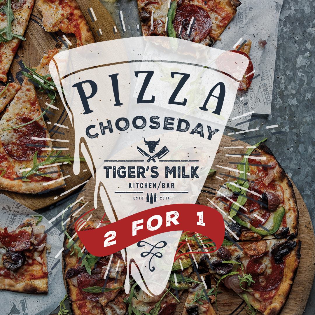 Every Tuesday , grab two Pizzas and get the second one on the house! A two for one special that will transform your Tuesday, visit Tiger’s Milk for decadent, discounted pizza. Buy one and get the second (cheapest) pizza free.