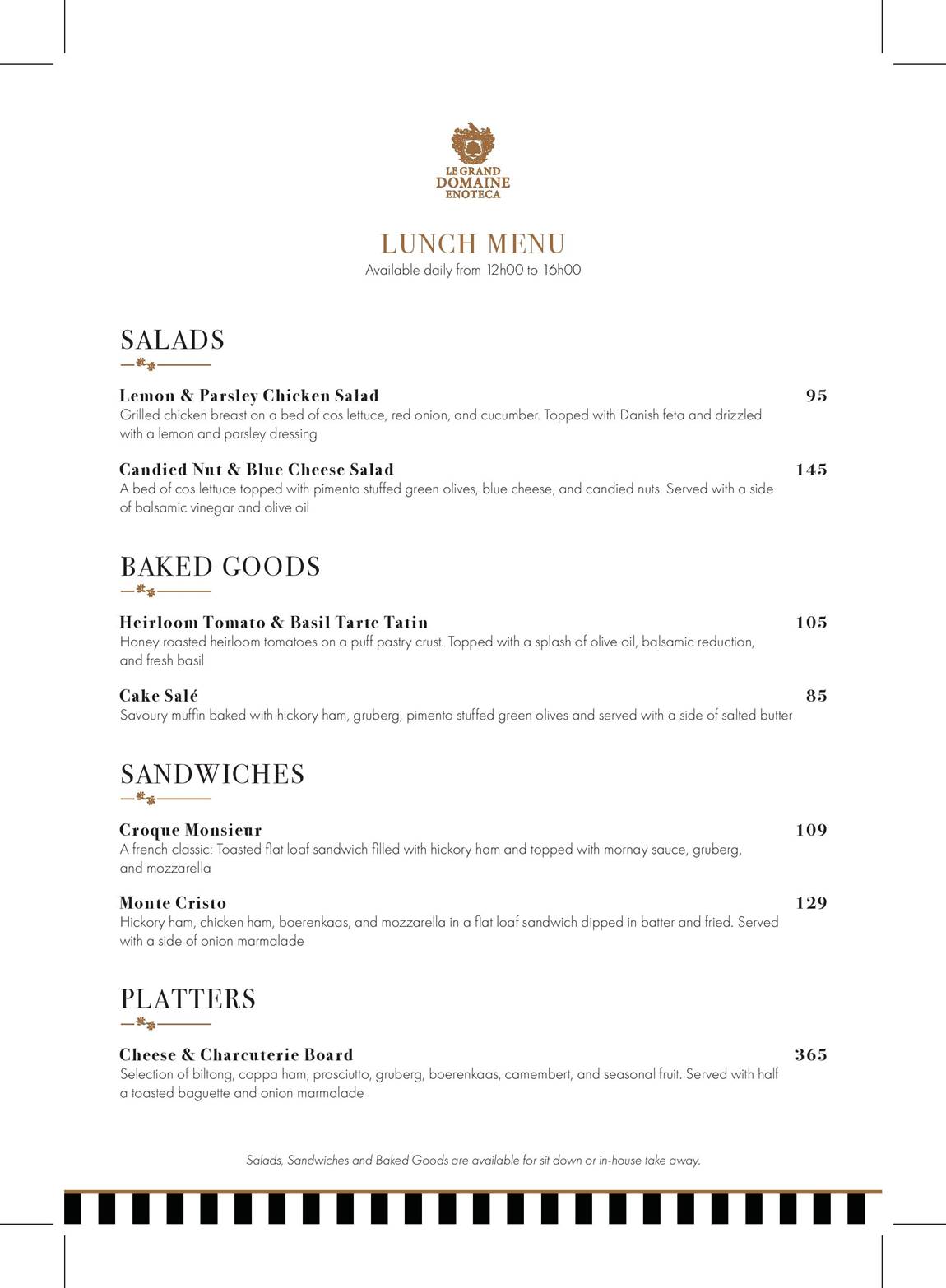Whether you choose to dine in-house and savor each bite amidst the elegant surroundings of Le Grand Domaine Enoteca, or opt for the convenience of a takeaway meal, the Lunch Menu promises an unforgettable culinary journey that transcends the ordinary.