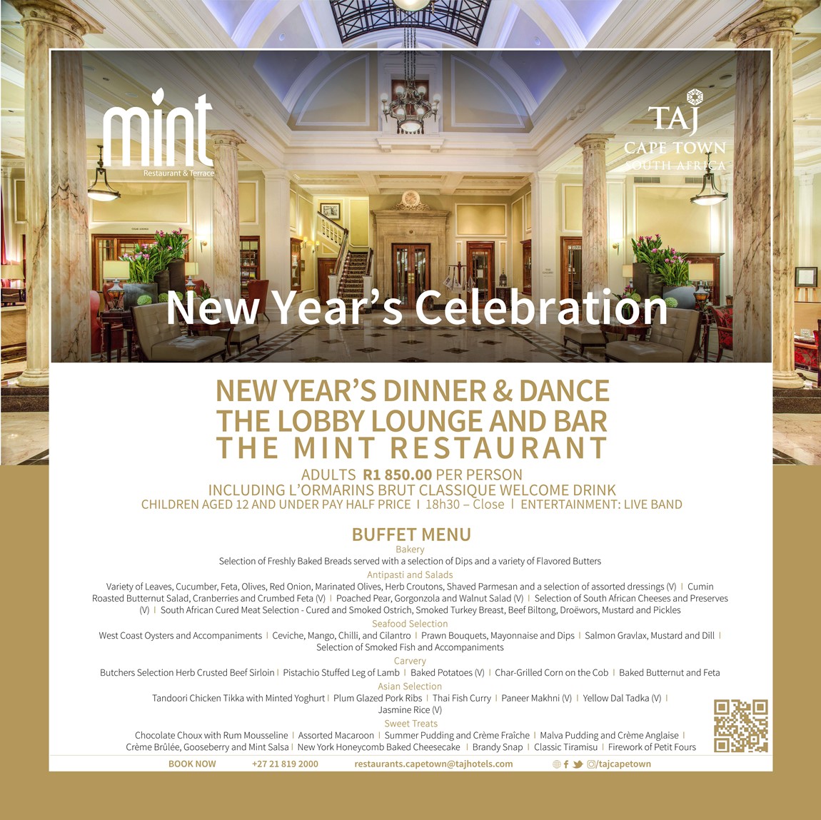 Join the Lobby Llounge and Bar and Mint Restaurant for a glass of L’ormarins Brut Classique followed by an incredible feast prepared by Executive Chef David Tilly and his talented team. There will be a live band for you to dance the whole night with your loved ones while enjoying an incredible buffet feast.