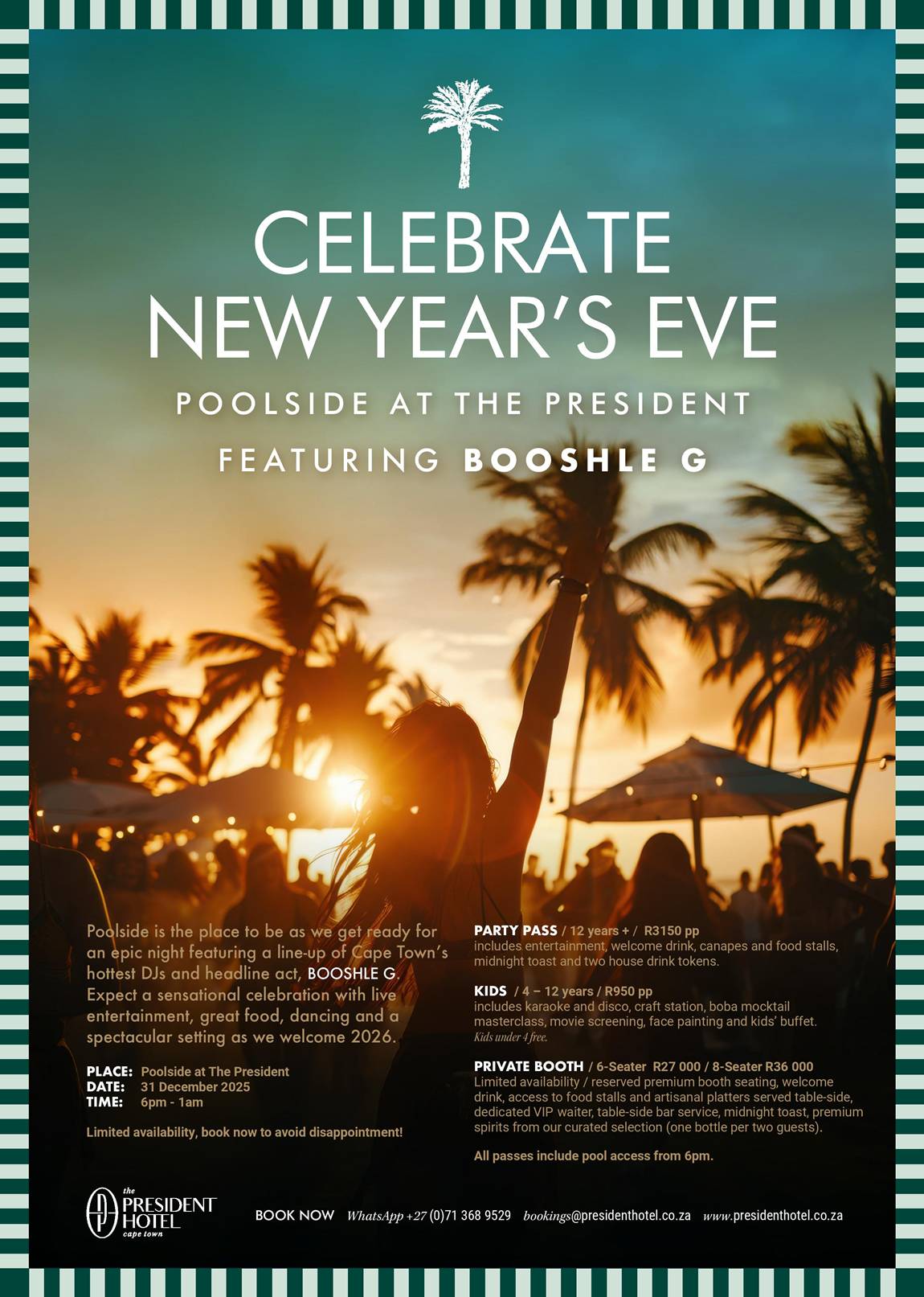 The President Hotel is hosting a New Year’s Eve celebration on 31 December 2025, featuring some of Cape Town’s hottest DJs and headline performer Booshle G.