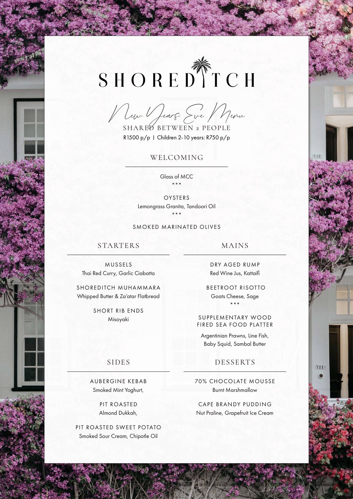 Celebrate New Year’s Eve in style at Shoreditch with a specially curated shared menu priced at R1500 per person, and children aged 2-10 at R750 per person