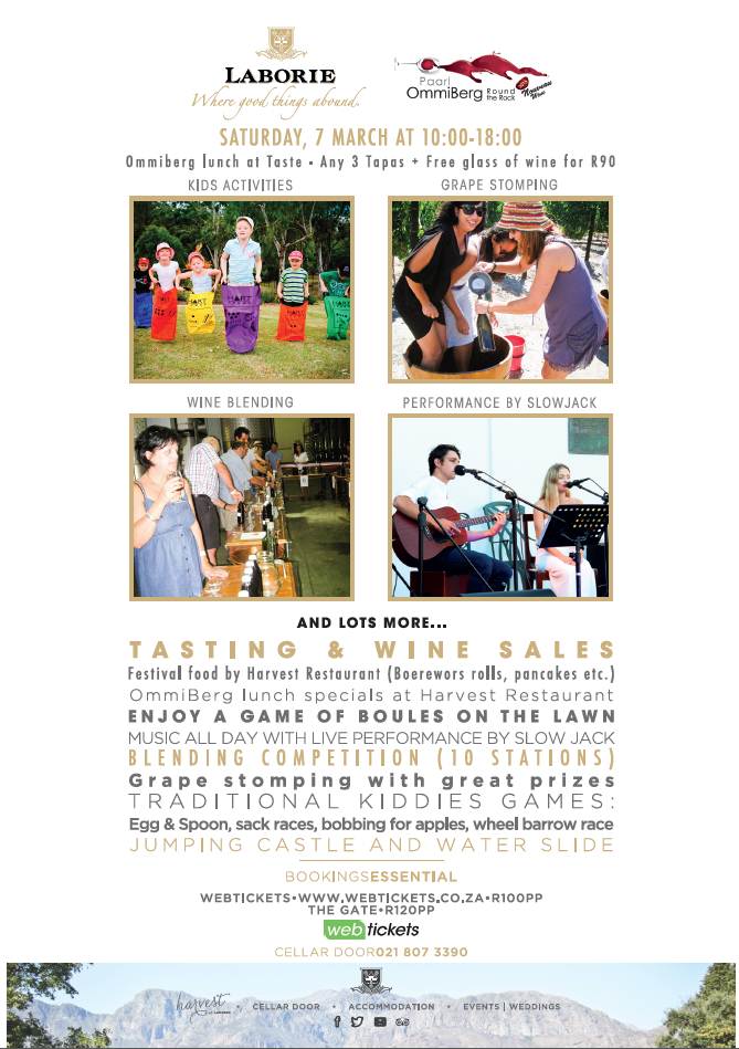 Lots of activities are being planned at Laborie Wine Estate to celebrate this festival with a great tapas specials that includes a glass of wine available for only R90. This is a great lunch idea to get the day started. In addition, lots of kids activities are being planned along with grape stomping and a wine blending course. Live music will also be performed by Slowjack.
