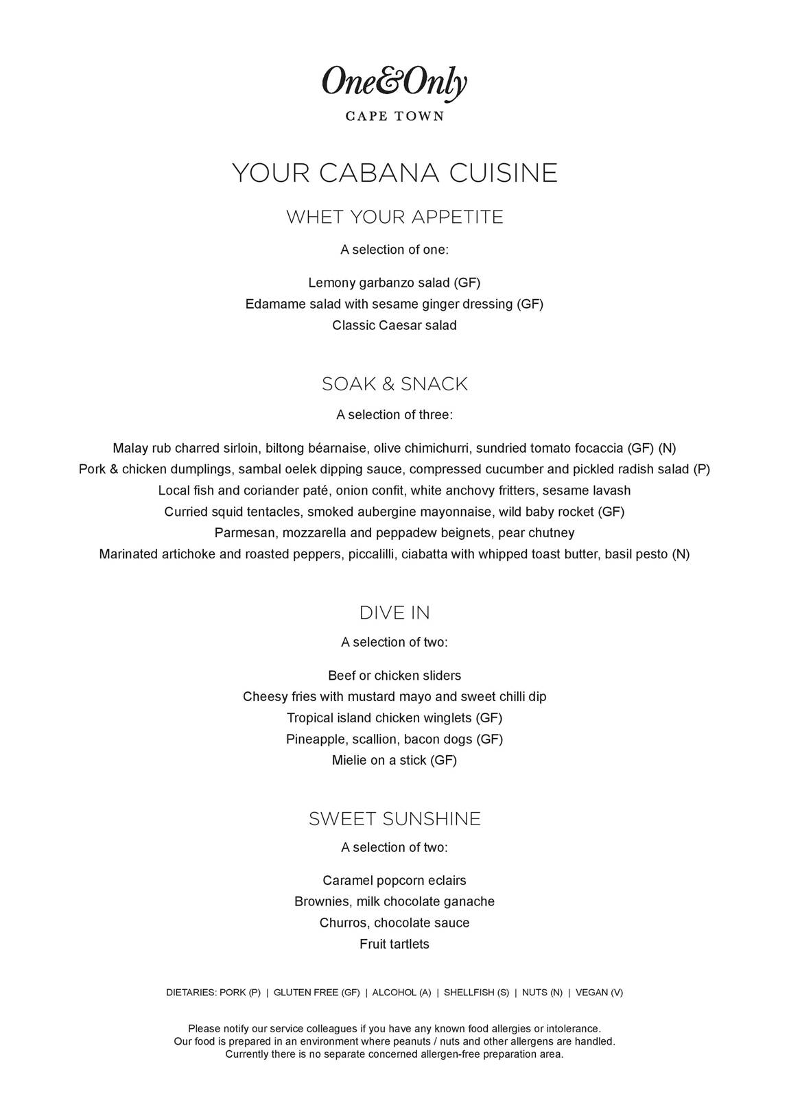 Browse the menu and decide on a selection of snacks to be enjoyed at intervals according to your preferences. The dedicated “Cabana Cuisine” menu features bright and fresh sharing-style salads, mouthwatering tapas, elevated easy-eating plates as well as summer-inspired sweet treats, of which guests are invited to select eight dishes. The package also includes a selection of alcoholic and non-alcoholic drinks including a bottle of One&Only Cap Classique, two cocktails, four beers/ciders as well as four soft drinks, two milkshakes and still or sparkling waters.