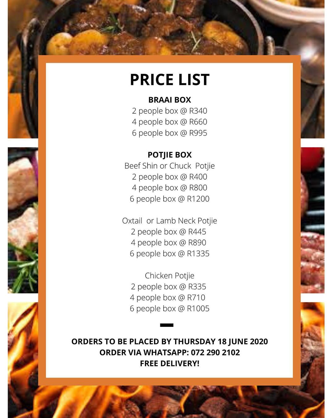 Or if you want to show you ultimate potjie master skills then order a potjie box, which comes in options of beef shin, oxtail, chicken, lamb neck or chuck, as well as all extra ingredients needed and cooking instructions. Boxes are available for 2, 4 or 6 people.