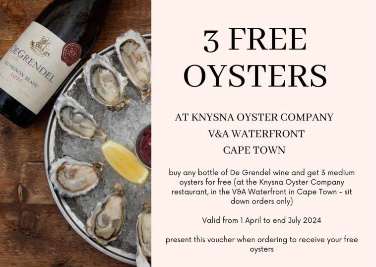 Until the end of July 2024, diners can enjoy three complimentary medium oysters with the purchase of any bottle of De Grendel wine.