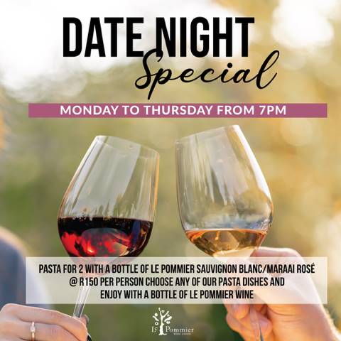 From Monday to Thursday, starting at 7pm, you and your partner can indulge in any of Le Pommier’s pasta dishes paired with a bottle of their signature Le Pommier Sauvignon Blanc or Maraai Rosé for just R150 per person.