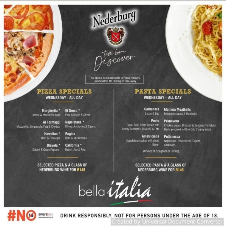 This special is for dine-in only and not available on public holidays. Make it a midweek ritual and let Bella Italia and Nederburg turn your Wednesday into a celebration of flavor and relaxation.