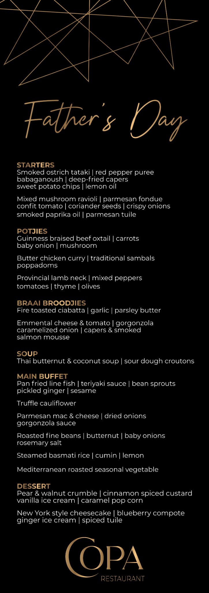 A chef – served buffet with delicious South African winter classics that will be enjoyed by the entire family that is available for R495 per person.