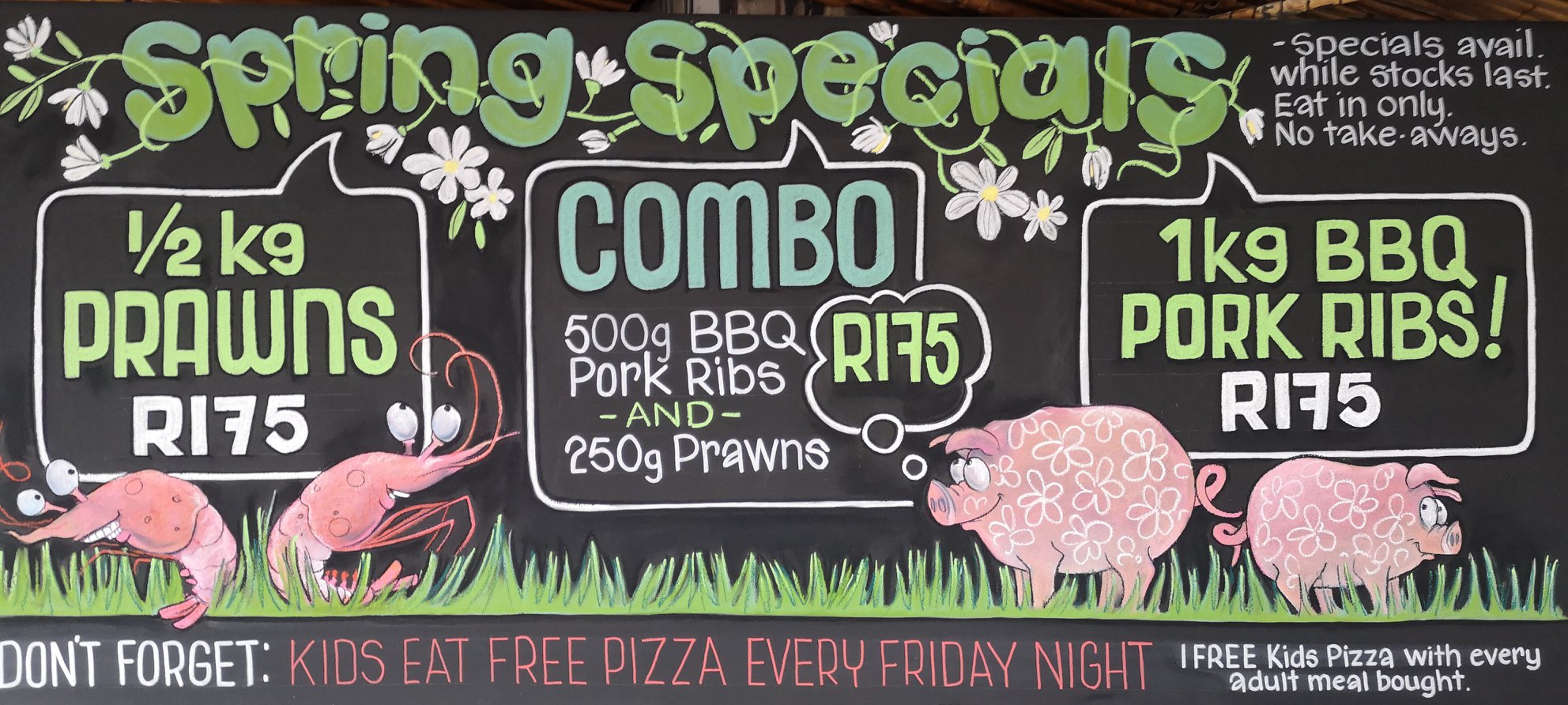 Enjoy a variety of specials when joining this Hout Bay favourite from Mondays to Saturdays with ribs, prawns and combos on promotion. A serving of 1/2 kg Prawns; 500g Bbq Pork Ribs & 250g Prawns Combo; and 1kg Bbq Pork Ribs are going for R175 each!