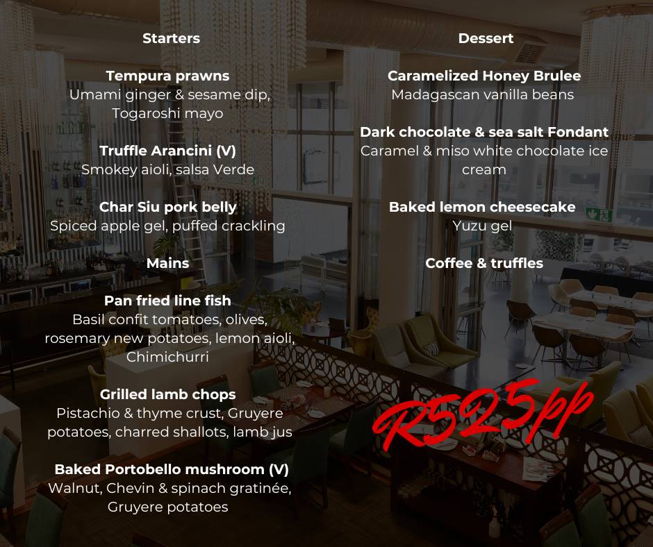 - The set menu at Liberty’s boasts a diverse selection of dishes, including starters like Tempura prawns, Truffle arancini, and Char siu pork belly. For mains, patrons can choose from Pan-fried line fish, Grilled lamb chops, and Baked portobello mushroom. The dessert options feature Caramelized honey brulee, Dark chocolate & sea salt fondant, Baked lemon cheesecake, and concludes with Coffee & truffles.