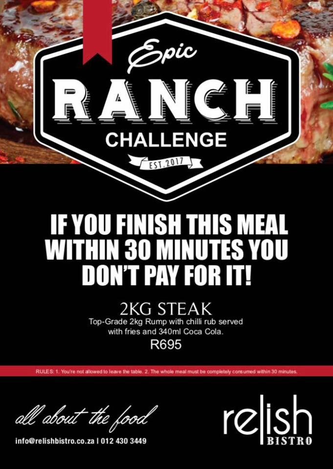 Relish Bistro is offering a 2kg top-grade rump steak with chilli rub served with fries and a 340 ml Coca Cola for R695. But if you finish this meal within 30 minutes, you don’t have to pay a single cent.