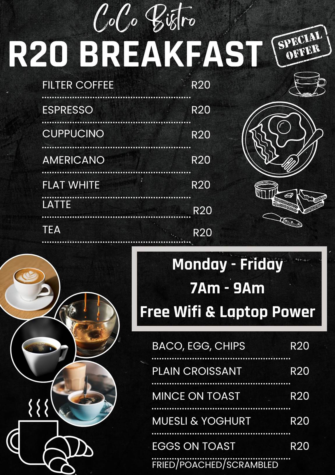 - For just R90, you can enjoy a delicious breakfast and a piping hot cappuccino, all made with the freshest, locally sourced ingredients.