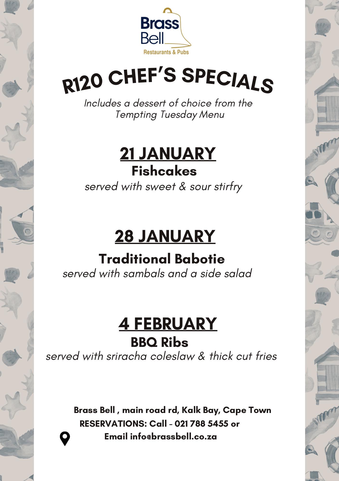Brass Bell in Kalk Bay is turning up the flavor with their R120 Chef’s Specials every Tuesday.