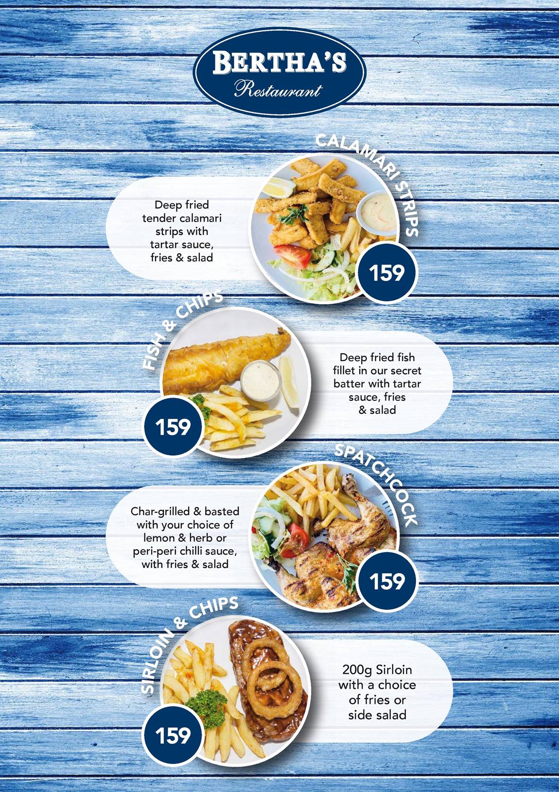 This one needs no intro. A deep-fried fillet of fish in Bertha’s secret batter, paired with fries and salad, and finished off with that oh-so-essential tartar sauce. Simple, satisfying, and always a hit.