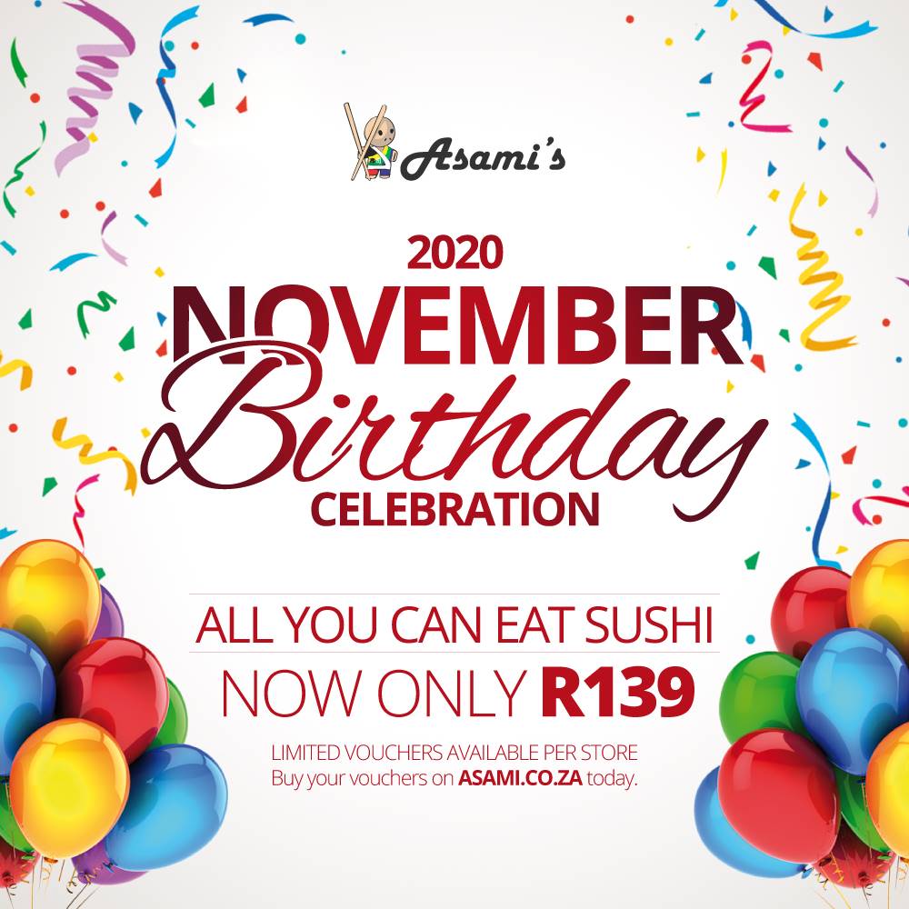 November is their birthday month and to celebrate, Asami’s is offering a limited amount of R139 all you can eat sushi vouchers.
