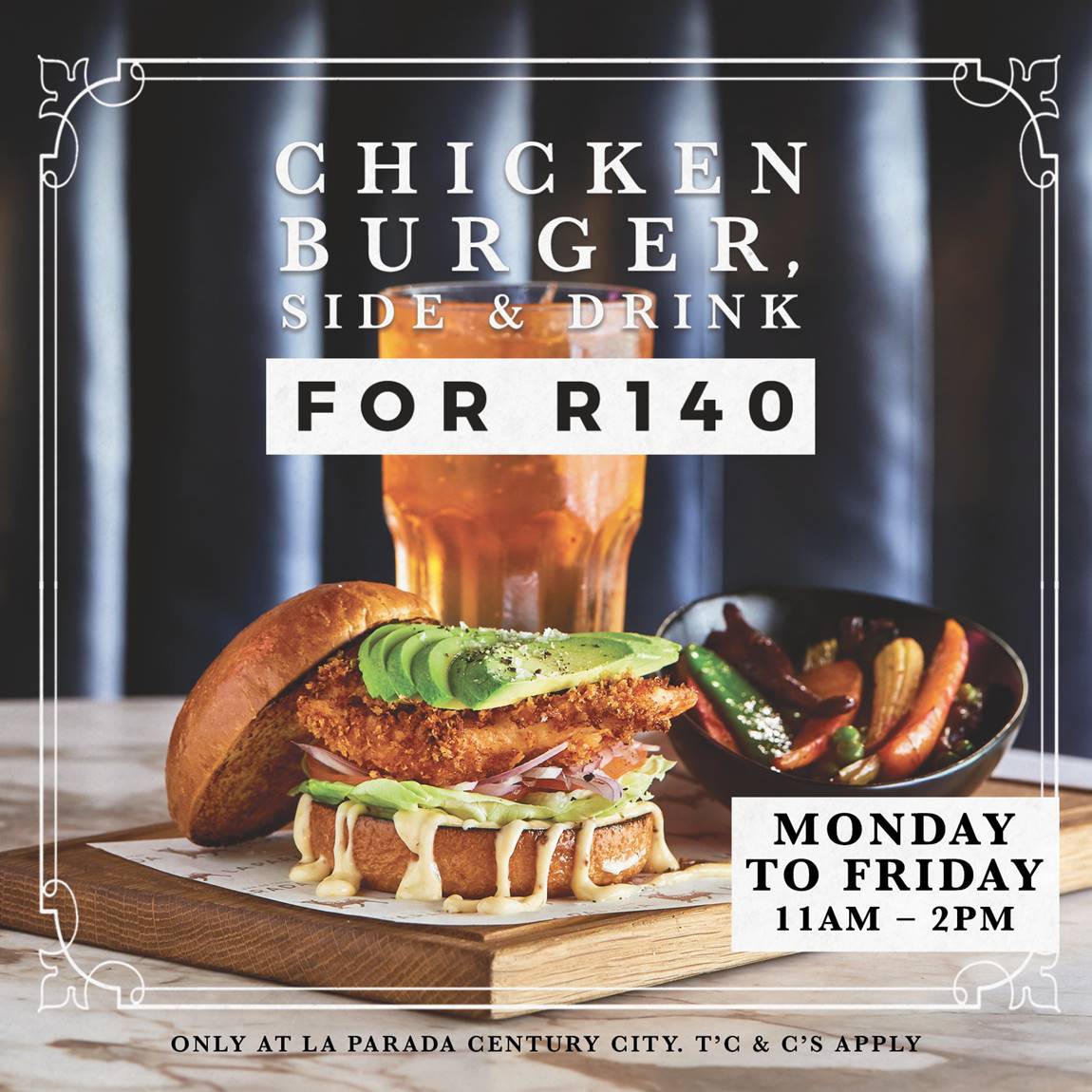 Come to La Parada Century City from Monday to Friday between 11am and 2pm for a tasty lunch special. Get a crispy chicken burger, plus patatas bravas or a side salad and a drink for only R140. Choose from beer, house wine or selected cooldrinks.