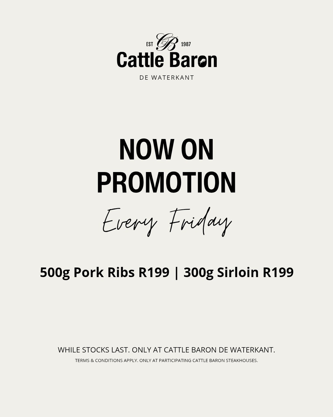 R199 for 500g Ribs or 300g Sirloin? Fridays at Cattle Baron De Waterkant just got interesting!