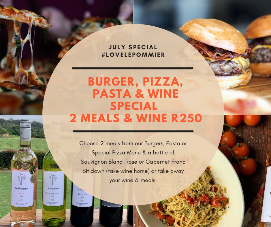 If you order any two burgers, pastas or special pizzas, you can add a bottle of wine for only R250 for the entire meal!