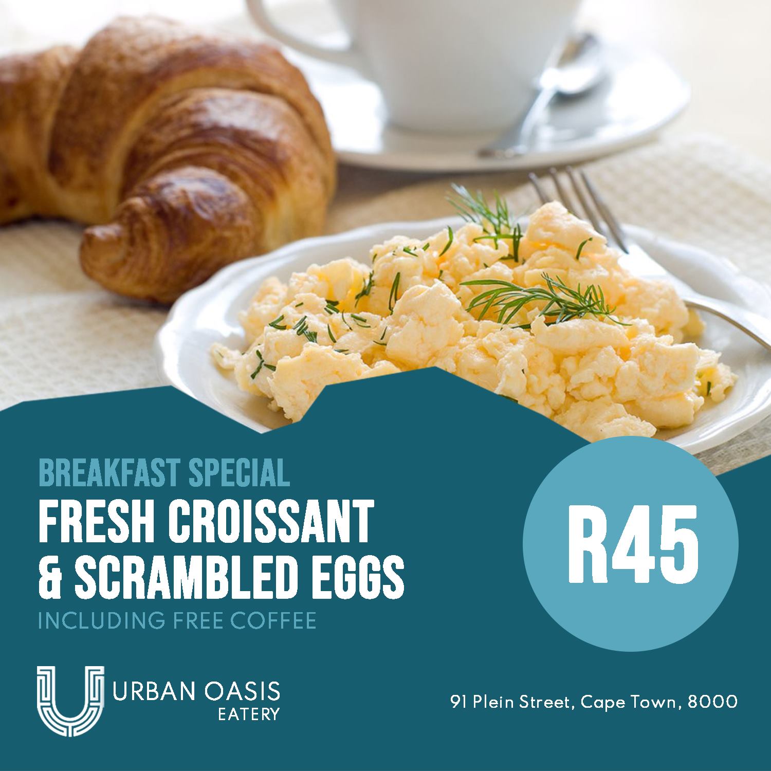 This includes a fresh croissant, scrambled eggs and a free coffee.