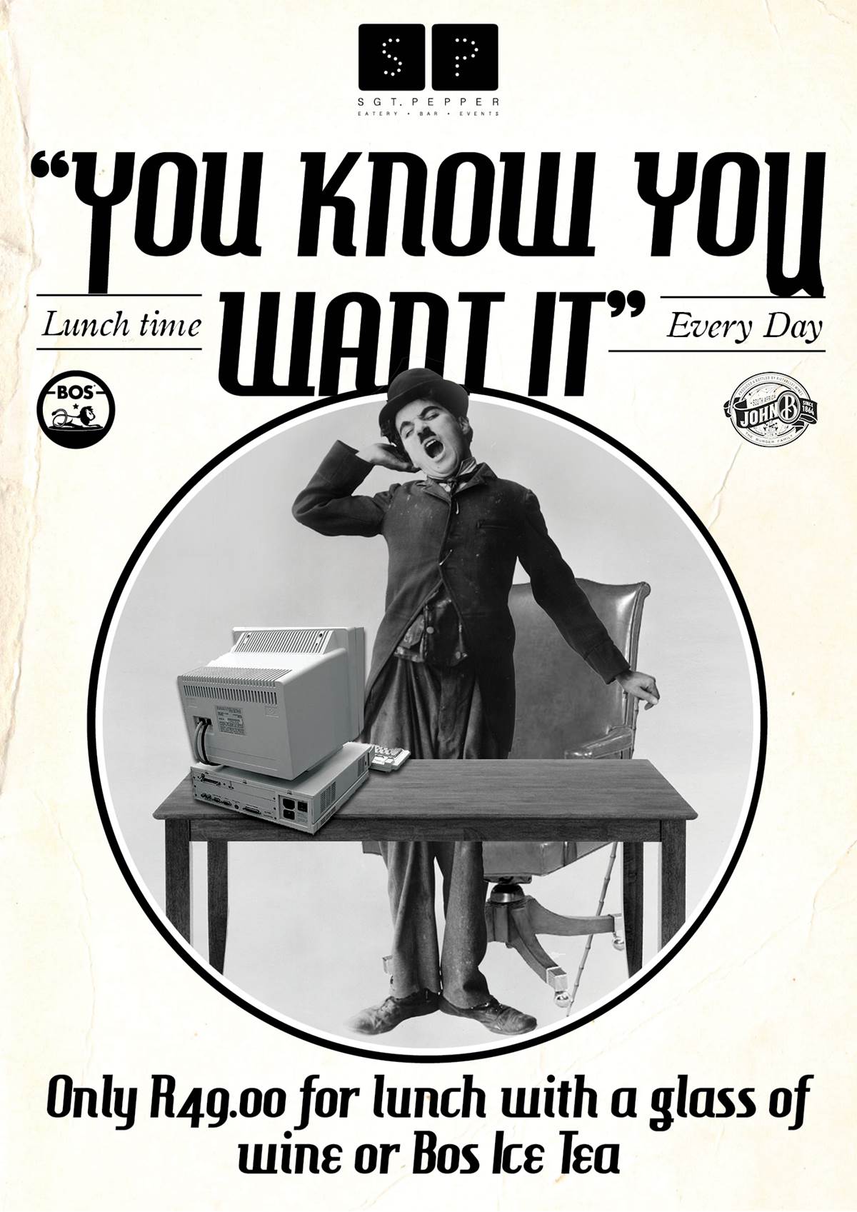 Now here is a lunch time special to rave about thanks to the guys over at SGT Pepper . Come get your lunch special from Mondays – Saturdays for a rocking R49. This includes your meal AND a glass of Rietvallei Estate John B wine or a BOS Iced Tea.