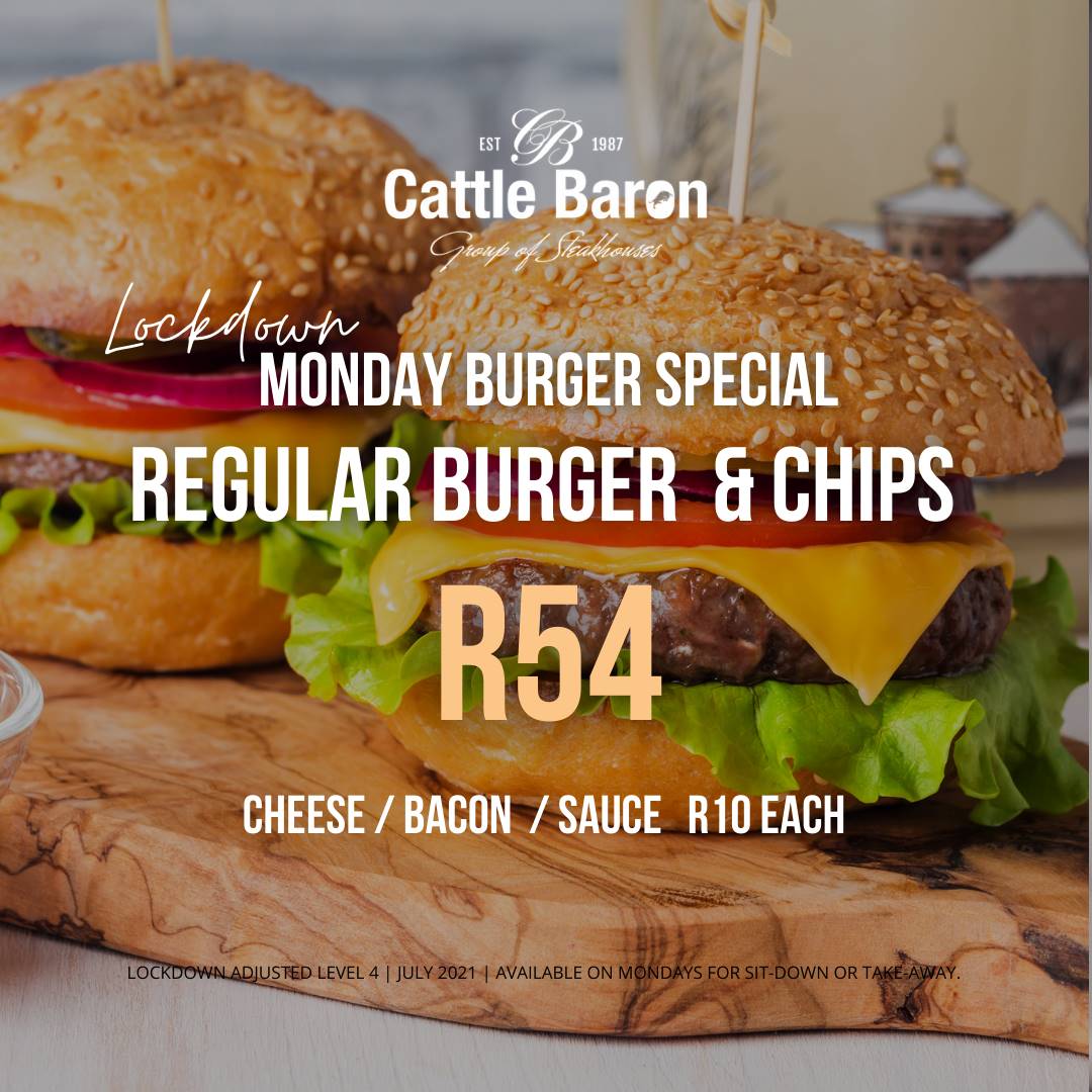 While each Cattle Baron is individually owned, specials and prices may vary from store to store. Please contact your nearest Cattle Baron to find out about their Monday Burger Special offering.