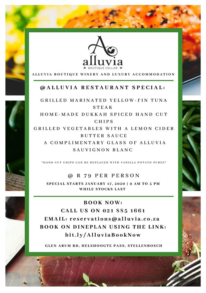 You can still enjoy a delicious tuna steak with homemade dukkah spiced chips and grilled vegetables for only R79. Plus you’ll receive a complimentary glass of Alluvia sauvignon blanc.