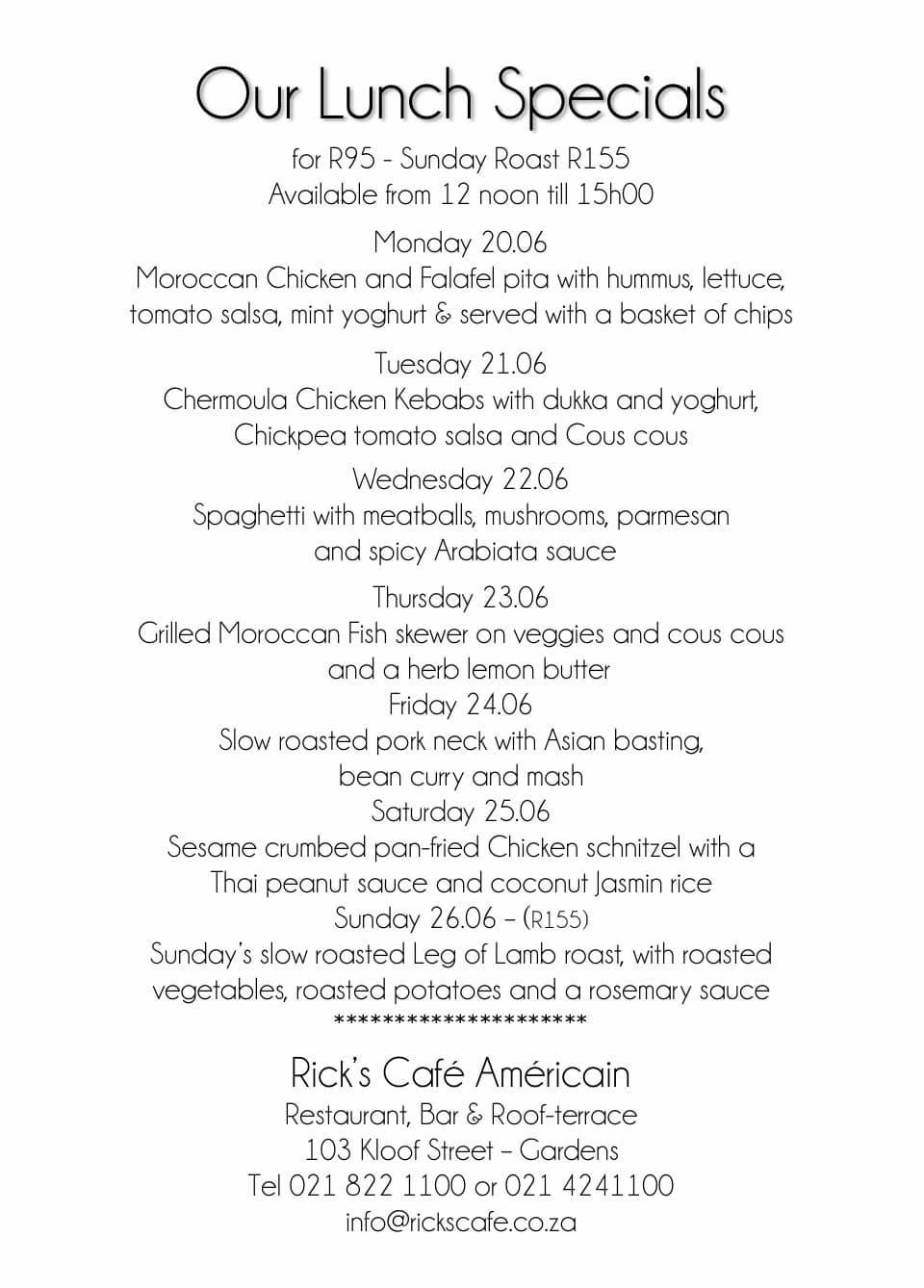 Lunch Specials in Cape Town | Ricks Cafe Americain