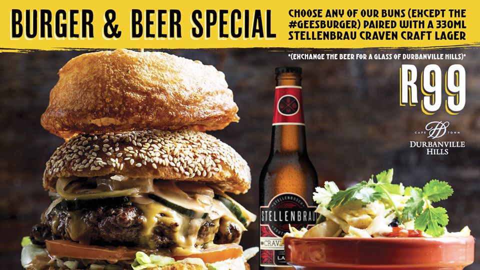 From Monday to Sunday, 11am-11pm, get any Beerhouse burger, except the Gees Burger, and pair it with a Stellenbrau Craven Craft Lager for only R99. Or swap the beer for a glass of Durbanville Hills wine.
