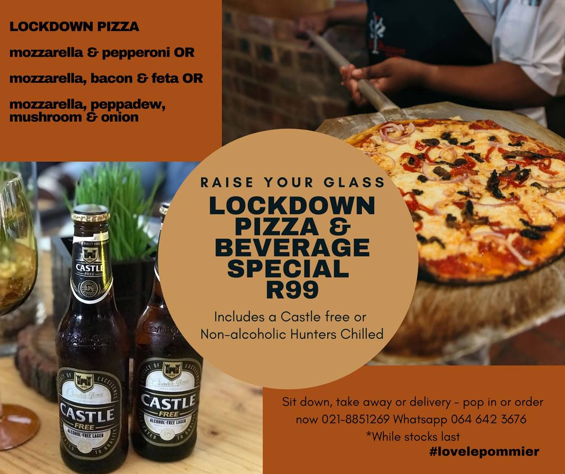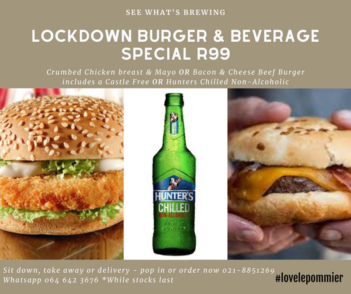 Pop in for a R99 LOCKDOWN Burger or Pizza Special!