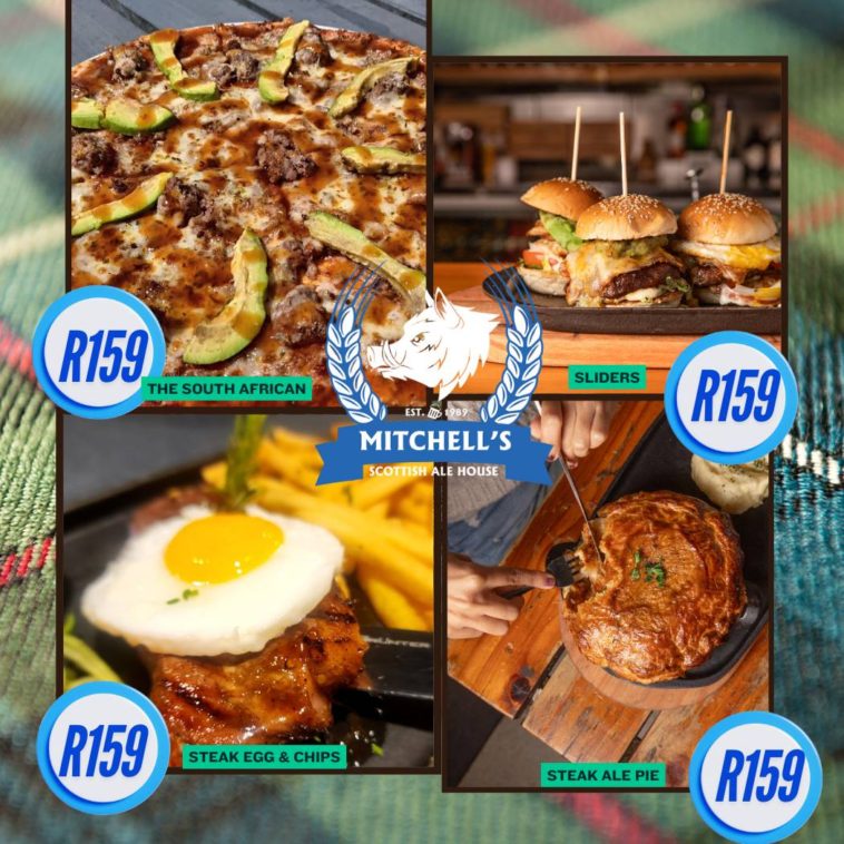 Steak & Ale Pie, steaks, egg & chips, your favourite South African pizza and Mitchell’s burger sliders are all on a menu for only R159.