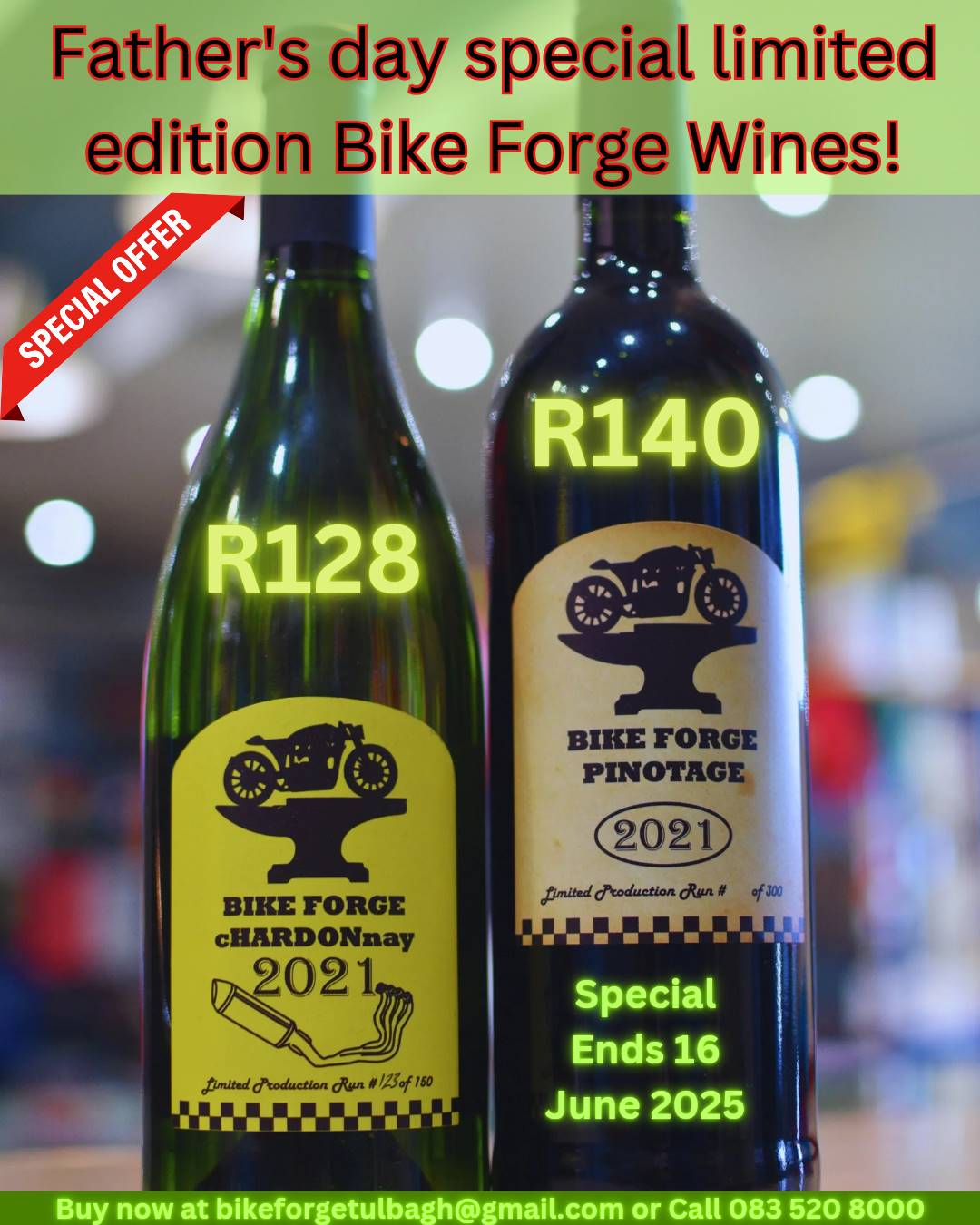 From now until 16 June 2025, wine lovers (and their lucky dads) can grab a bottle or two of the Bike Forge’s exclusive 2021 vintage — a crisp, rebellious Chardonnay at R128, and a bold, no-nonsense Pinotage for R140.