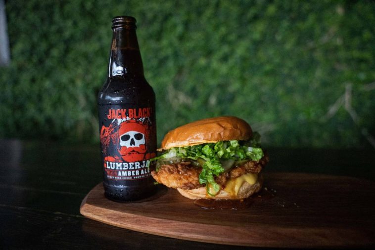 “I decided to create a Fried Chicken Hot Honey Burger, which pairs perfectly with our seasonal release, The Lumberjack Amber Ale. This pairing is ideal because the Lumberjack’s notes of caramel and toasted bread provide a slight sweetness, while its lingering hoppy bitterness complements the spice from the chili flakes, the sweetness of the honey, the creaminess of the sriracha butter and the crunch from the shredded lettuce”.