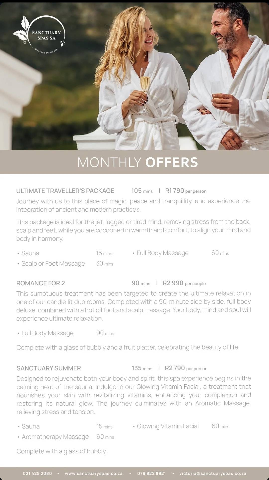 - Finally, the Sanctuary Summer package blends the calming heat of the sauna with a glowing vitamin facial and a stress-relieving aromatherapy massage. This 135-minute treatment is a holistic journey to restore your skin and spirit, priced at R2,790 per person.