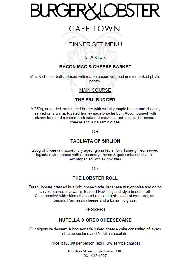This year, Burger & Lobster will be part of Restaurant Week (18 April – 5 May) offering a lunch menu (2 courses) for only 200 per person. A 3 course dinner menu for R300 is also available.