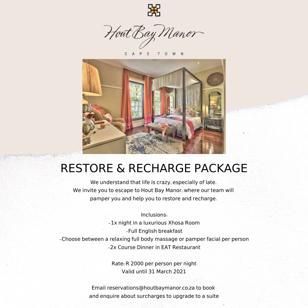 The Recharge & Restore Special package at Hout Bay Manor is designed to do just that and is available for only R2000 per person per night.