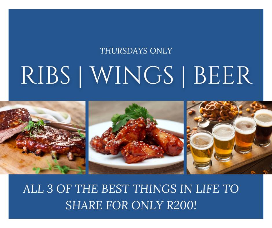 500g Pork belly ribs, 200g Chicken wings, triple cooked fries, crispy oninon rings and 2x 500ml Born Slippy Lager