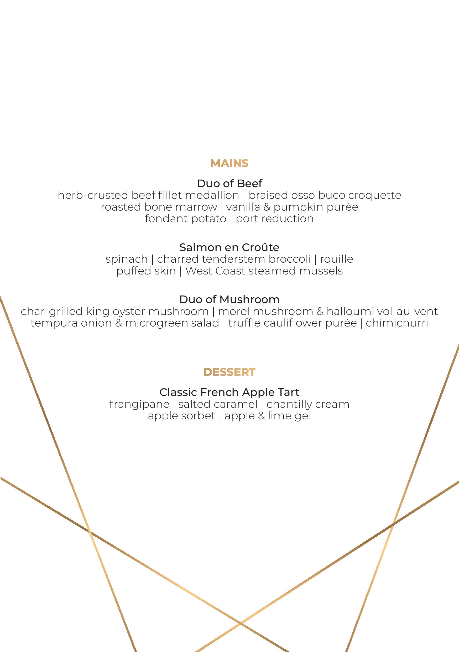 ✨ Main Dining Experience – R1,650 per person: An opulent, multi-course gala dinner in COPA Restaurant, complete with all the culinary bells and whistles.