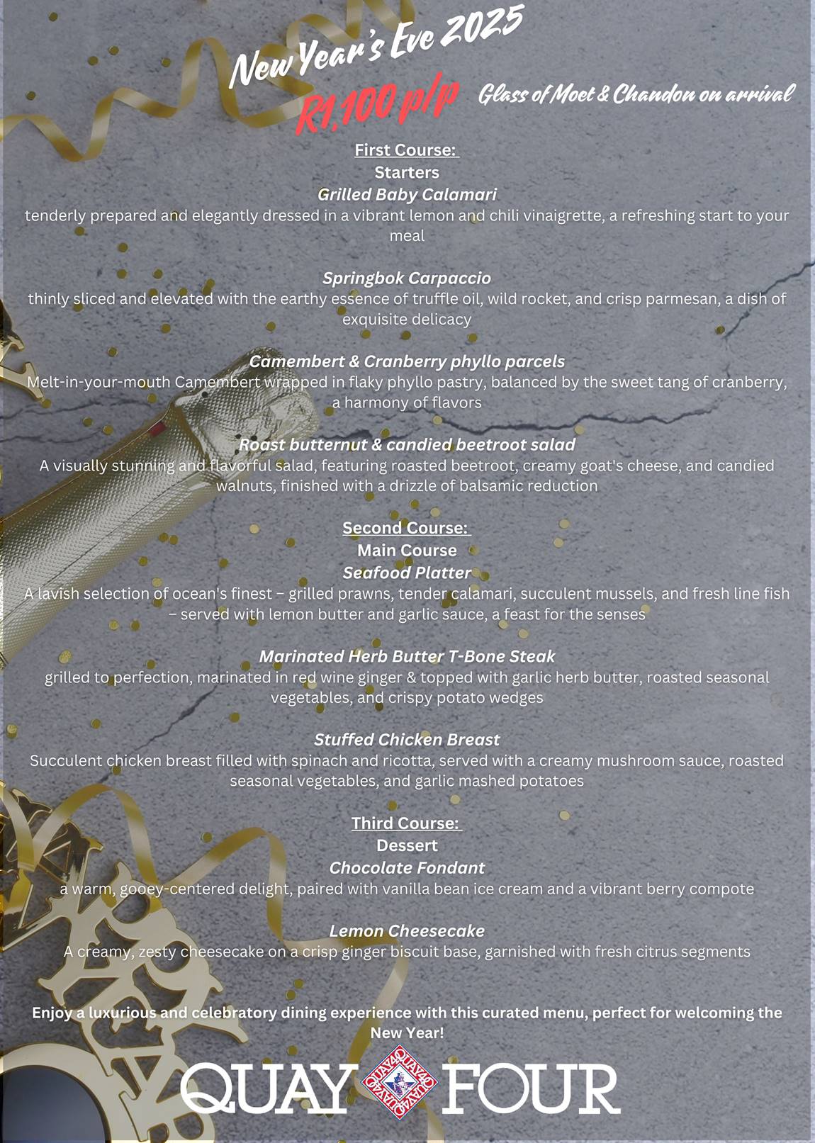 Celebrate New Year’s Eve in style at Quay 4 Tavern, where an unforgettable culinary experience awaits.