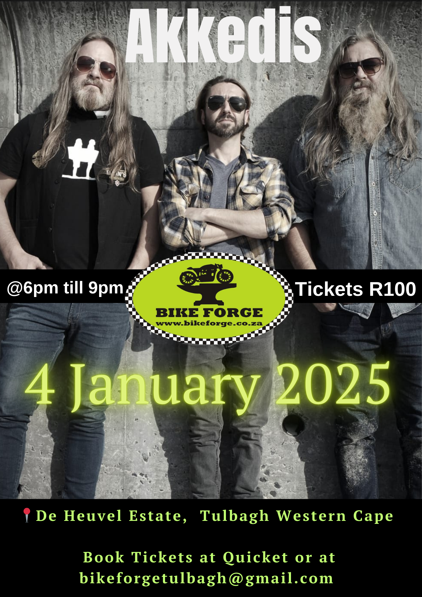 Book Your Spot: Tickets are available now on Quicket at https://www.quicket.co.za/events/295772-akkedis-live-at-bike-forge/ or via email at bikeforgetulbagh@gmail.com. Don’t wait—secure your ticket today and join the celebration at Tulbagh’s premier live music venue.