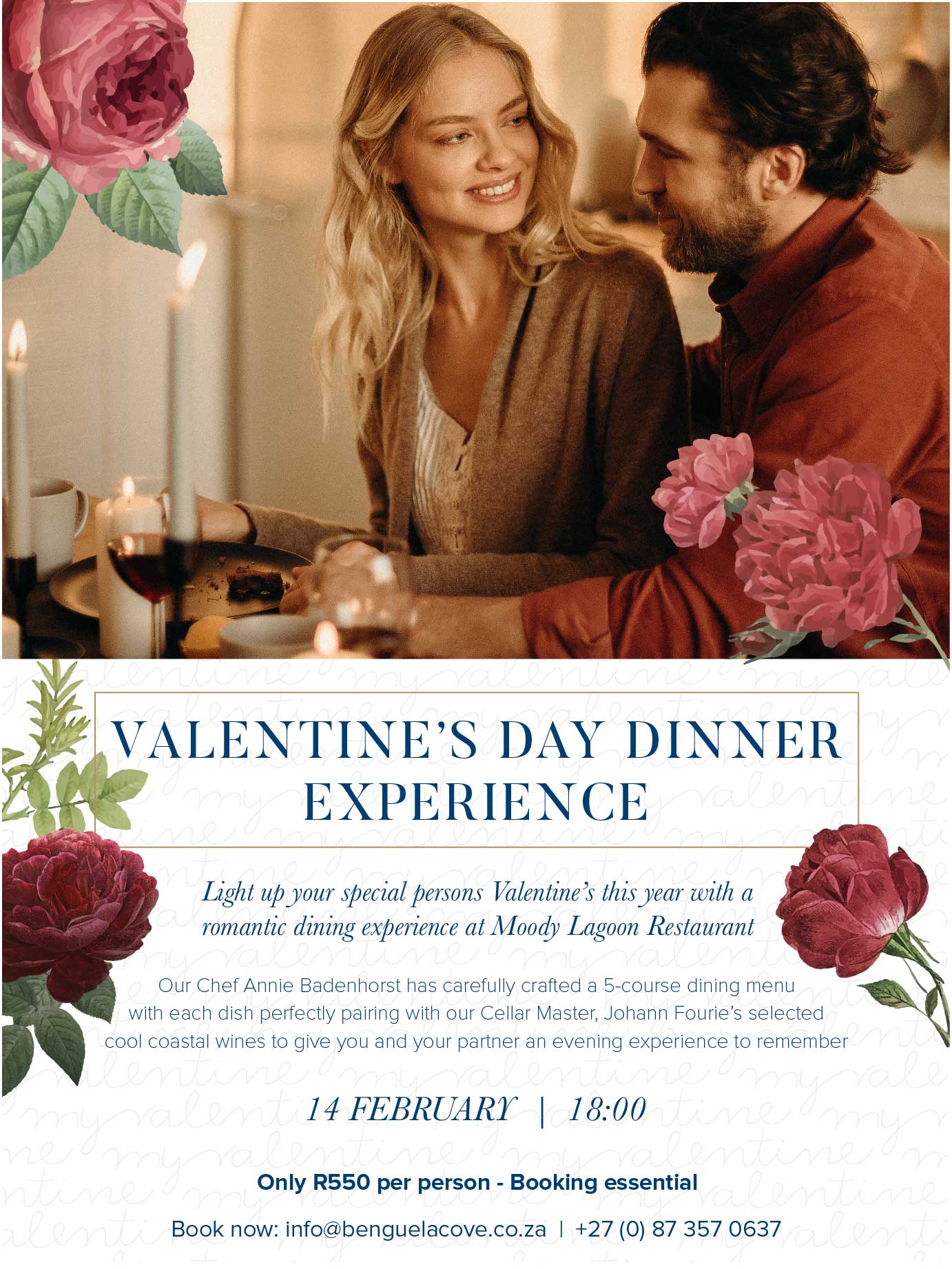 Bring your loved one to the Moody Lagoon Restaurant this Valentine’s Day from 6-9pm for a romantic five course meal carefully crafted by chef Annie Badenhorst. Each course will be paired with perfectly selected coastal wines. The cost is R550 per person.