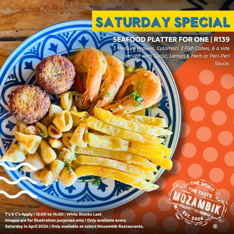 Dive into the ocean’s bounty with Mozambik’s Saturday Special Seafood Platter for One, priced at an irresistible R139.