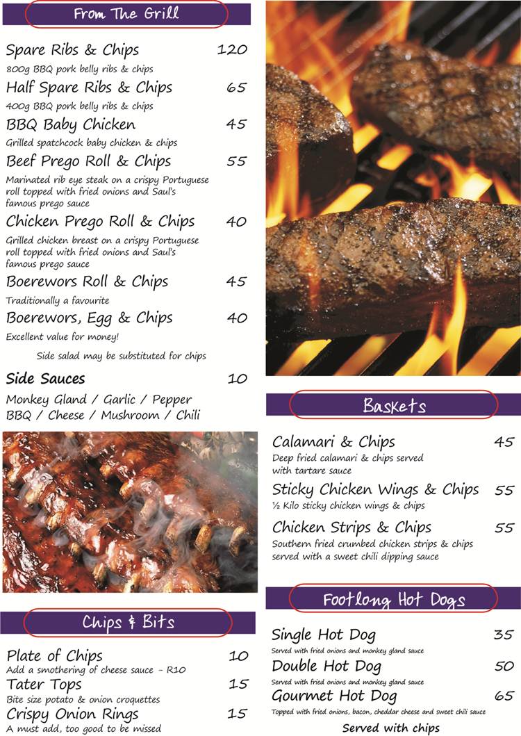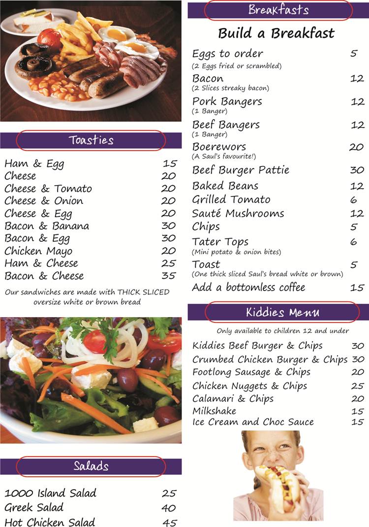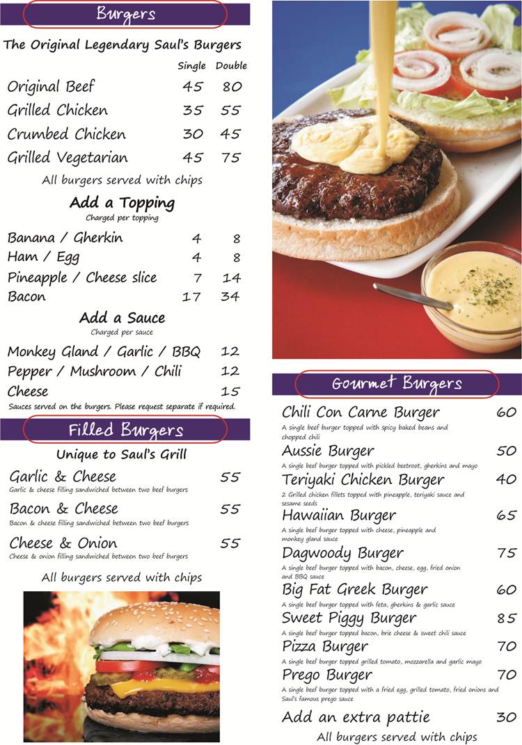 Saul’s Grill was opened as a small late night take away in the late eighties. The Sea Point restaurant has since grown to being a full service restaurant and pub. Saul’s is unique in that it is the only full service restaurant on the Atlantic Seaboard that operates 24 hours a day. Besides boasting what has been called the best hamburger east of the Atlantic, Saul’s is well known for it’s huge helpings and good value for money. Try to Beat the Burger.There are always ridiculous specials running and you are guaranteed not to walk away hungry. We pride ourselves on our friendly efficient service, top quality food and festive environment and look forward to serving you