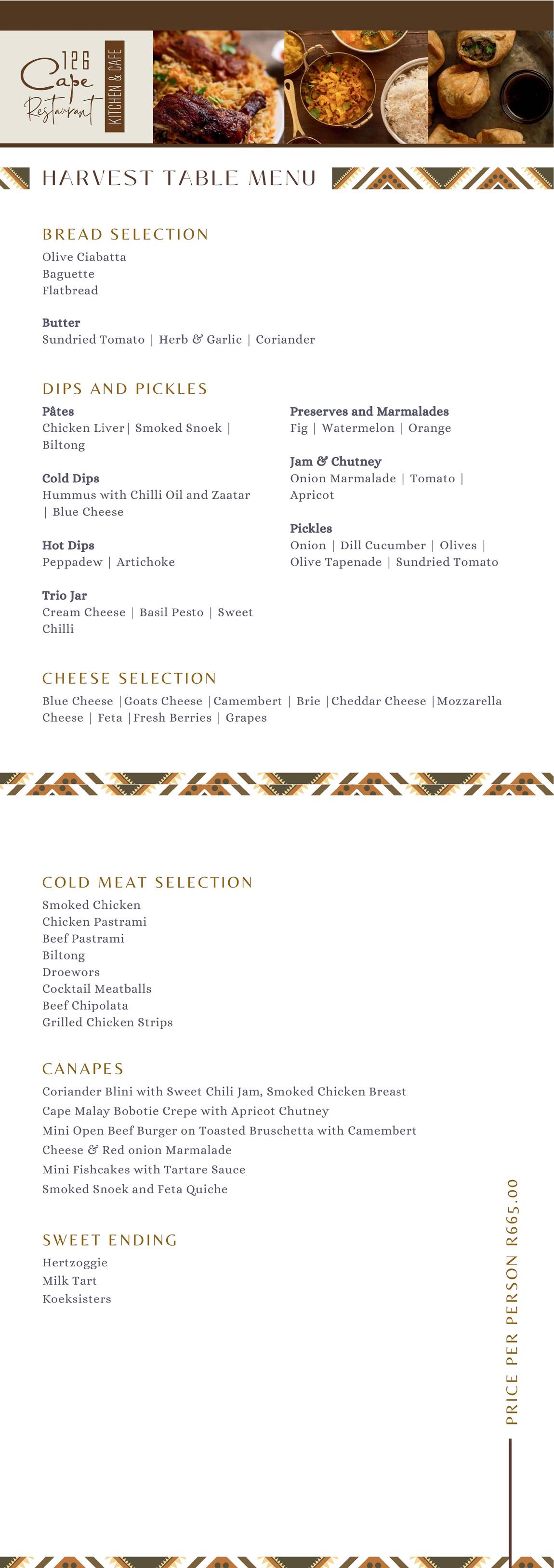 - The Harvest Table kicks off with a selection of freshly baked bread, paired with tantalizing dips and pickles. Cheese lovers will relish in the carefully curated cheese selection, while cold cut meats and seasonal canapés provide a mouthwatering assortment of savory bites. To end the meal on a sweet note, an irresistible spread of desserts awaits, making this dining experience truly unforgettable.