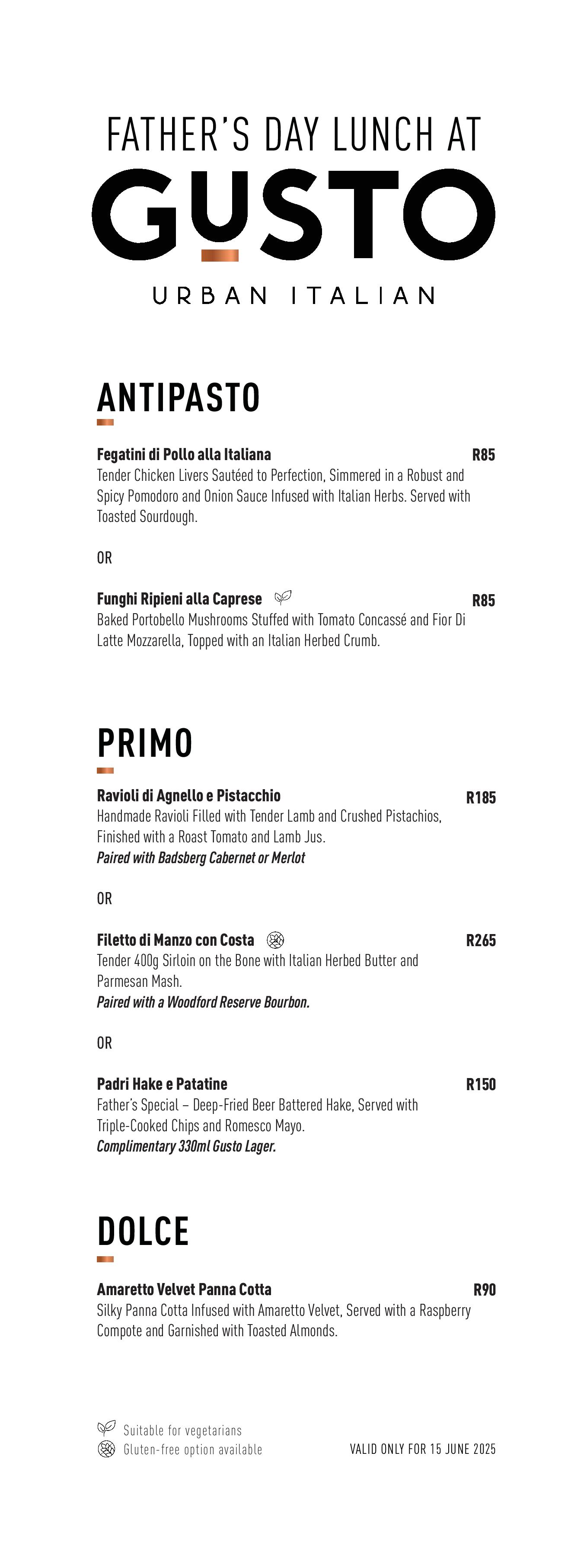 Book your table now and give Dad the real gift this year: great food, good wine, and the joy of not having to grill anything himself. The Gusto team’s got it covered.