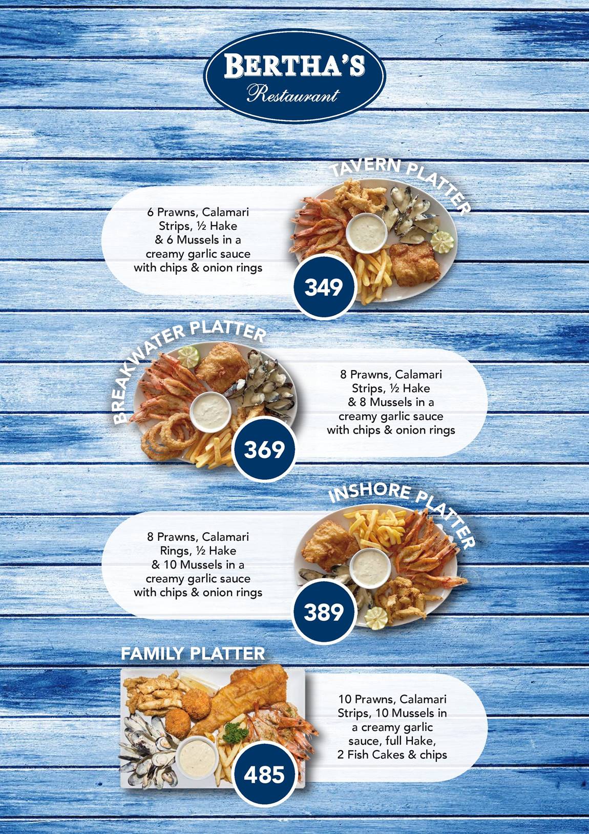 Feeding a hungry crew? This one’s a showstopper. The Family Platter packs in 10 prawns, calamari strips, 10 mussels, a full hake, two fish cakes, and a mountain of chips. At R485, it’s a value meal for seafood lovers who don’t mess around. It’s basically a beach holiday on a plate.