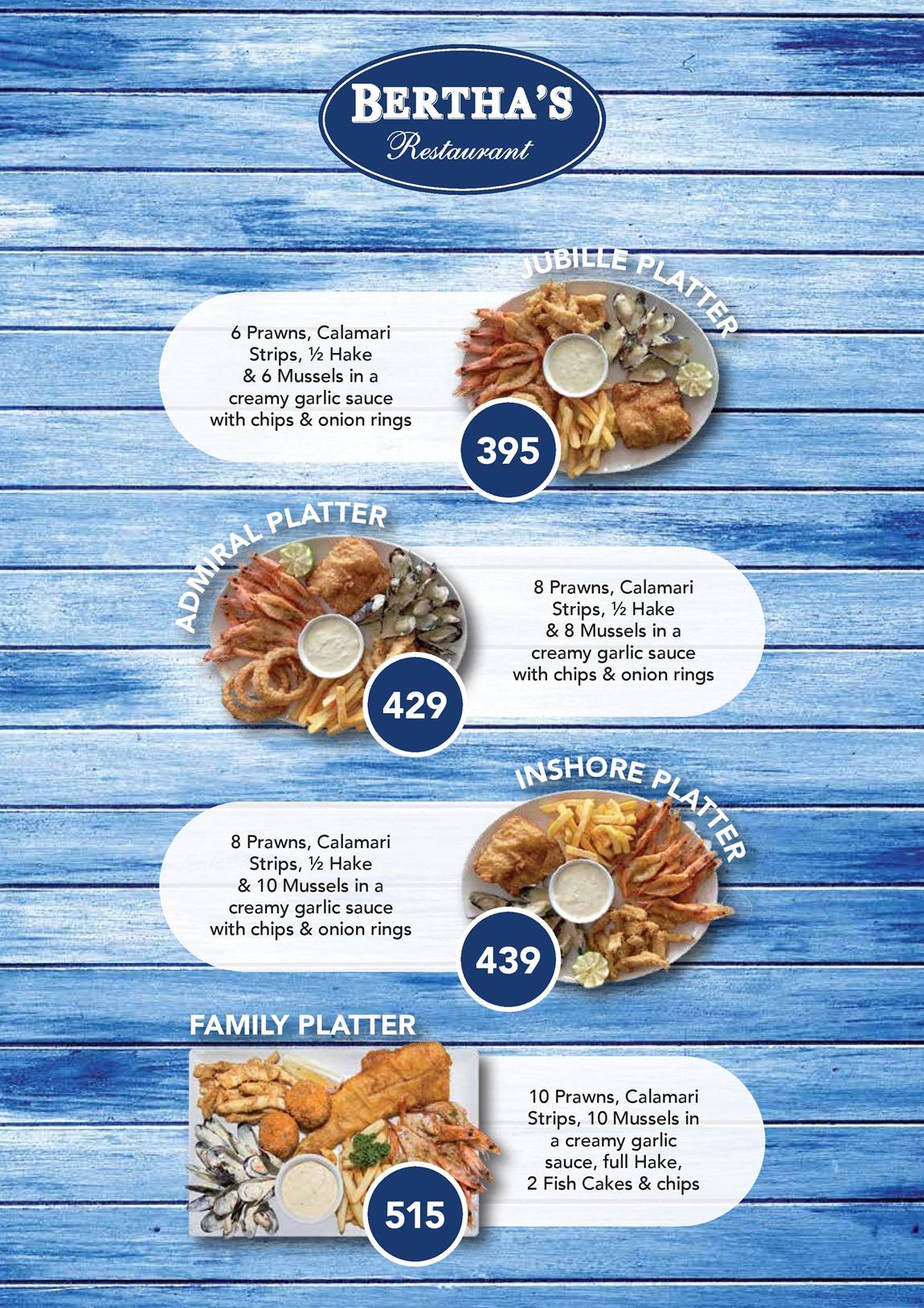Family Platter (R515) The ultimate feast designed for sharing at the table. It includes 10 prawns, calamari strips, 10 mussels in creamy garlic sauce, a full hake, 2 fish cakes and chips. Perfect for families or groups who want to sample a wide variety of Bertha’s seafood favourites in one go.